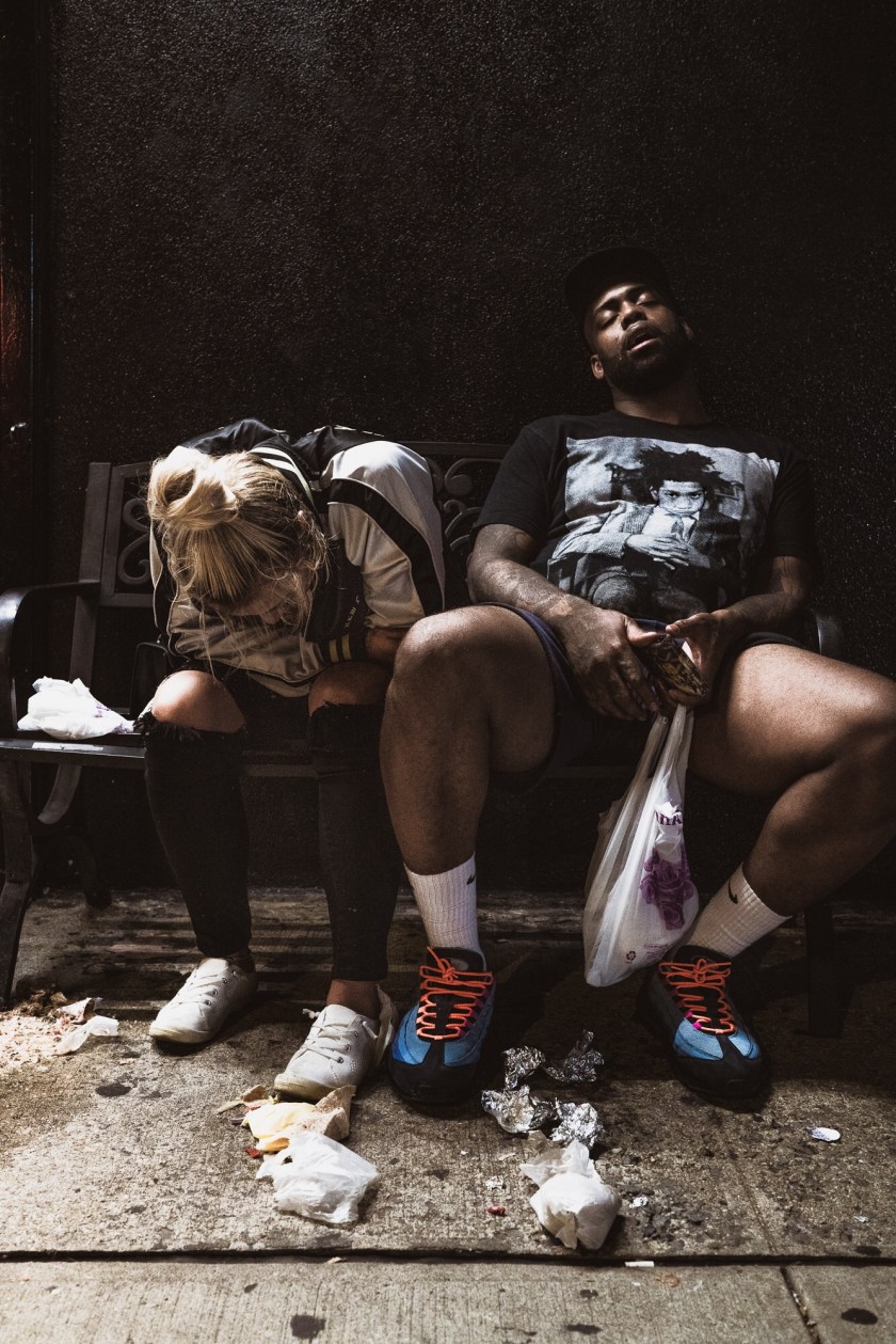 Two blocks home and I was back with my camera….and I saw that the scene had changed. She was not alone and now had a man next to her, equally vaporized by whatever they had bought in good faith. I was disappointed by the loss of the previous narrative…and then I realized that the image before me was more important than I had at first understood. I felt that this couple, who were clearly not homeless or otherwise a stereotypical depiction of addiction were more powerful because of their ordinary appearance. People who are going to work, on the subway, in the supermarket, in a restaurant….people that are neighbors and friends and sisters and sons. Regular everyday people who went out to buy drugs at night, got sandwiches, and then were overcome by the unexpected power of whatever it was that they ingested as they sat with their late meal. Her hands were beautifully manicured and his accessories were carefully chosen. For me, this is street photography…pictures of life. Pictures of exactly what I see and how what I see is translated by my feelings into an image.