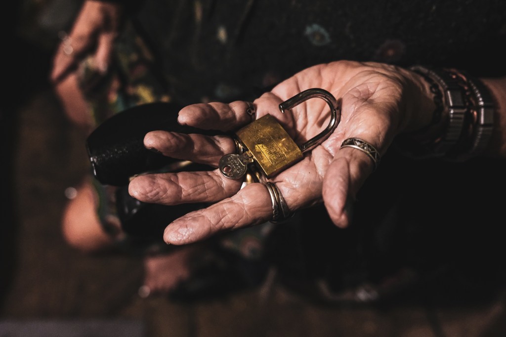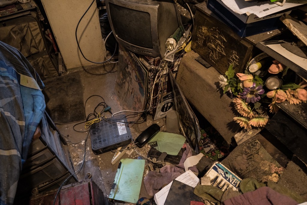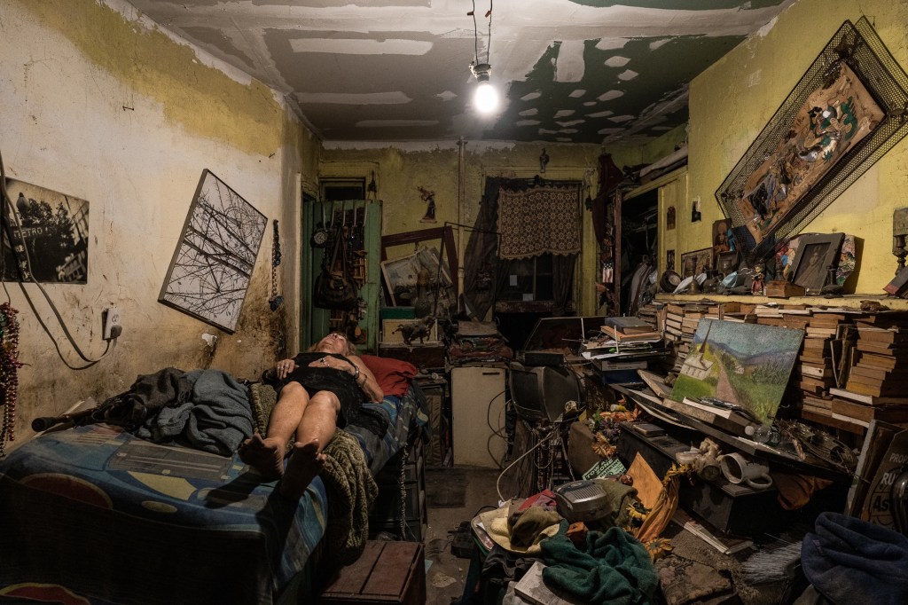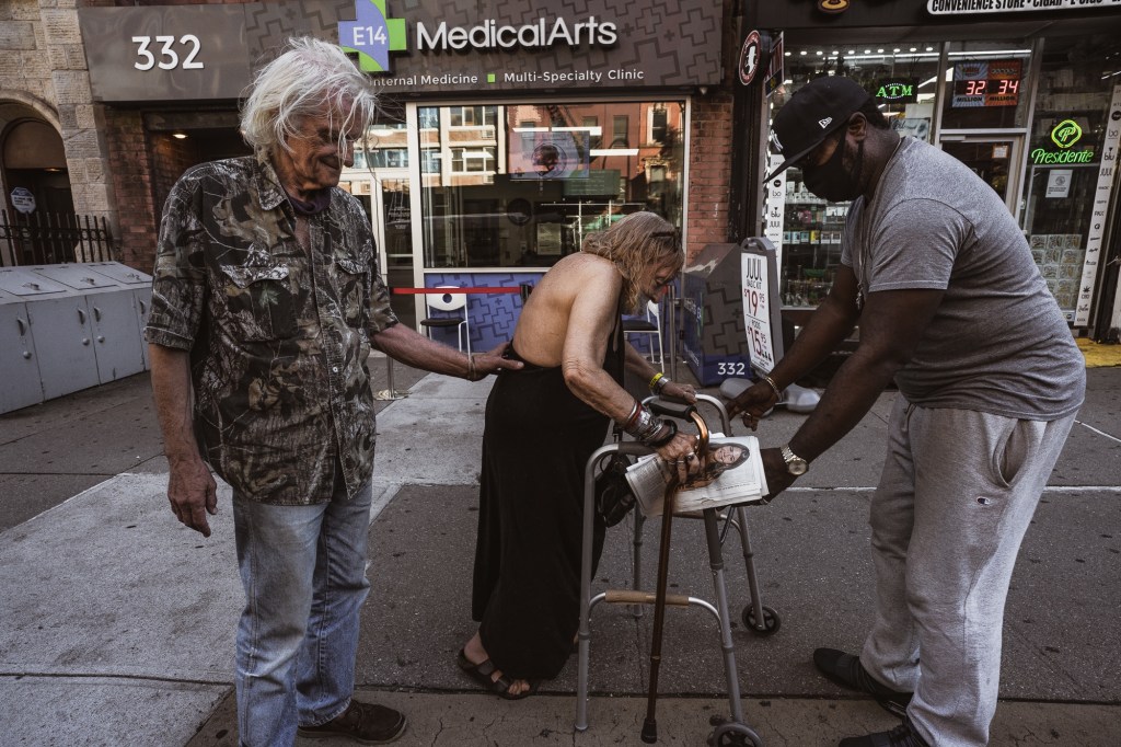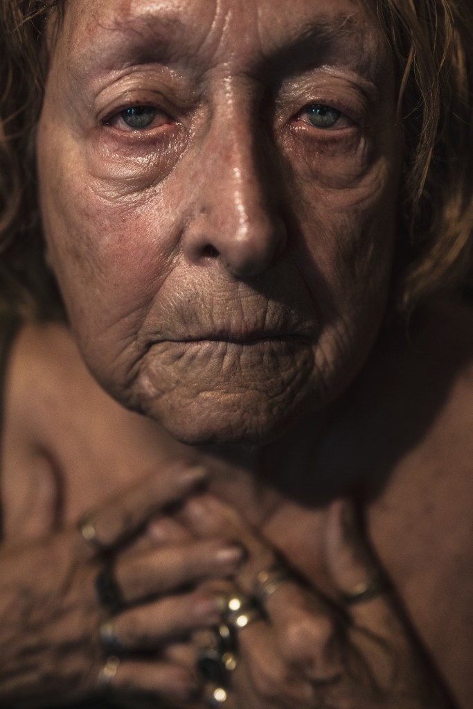 Memories stored in an old address book. Everything touched in Ginette’s apartment seems pressed and softened by handling. Paper is worn and smoothed from being held many hundreds of times, kept in spots that haven’t been cleaned in many years. Pictures of Ginette at her seventieth birthday party, snaps taken as she rifled through the contents of a garbage can, pictures with dogs that accompanied her on her journeys throughout the East Village over the years but who passed away long ago.Ginette at forty-nine years with Charlie in 1986.November 2019….Ginette holds a picture of herself taken when she was in her late forties.November 2020…. Big changes in the year 2020 as Ginette’s health has significantly deteriorated. After a summer spent in a nursing home, and intervention by Adult Protection Services, she clings to her life inside her apartment, desperate to avoid a court order that will remove her. After workmen partially destroyed her collection and personal possessions, she struggles to care for herself physically. Because of haphazardly done repairs to the ceiling in her apartment, an onslaught of bugs—cockroaches and bedbugs—infested her apartment after years of being held in check. Dust and ancient pieces of crumbled ceiling plaster, some of it pulverized into a fine particulate, covered almost everything in a filthy, powdered grime. November 2020, a few days before her apartment was partially destroyed by workmen. A workman stands in Ginette’s apartment, after painting over the area that was repaired.Ginette sits after returning to her apartment after a day spent downstairs on a bench outside her building as she waited for workmen to replace a piece of the ceiling that was collapsing. Without proper protection for her living space, they left the apartment in an untenable state. Some items were missing and presumably discarded, others were destroyed during the repair. Pictures hung crookedly, papers were torn and deeply damaged by soot and dust and plaster as well as decades old detritus that had built up in the walls, detritus from rodents and bugs and years of neglect.Television and phone were damaged and left on the floor. The apartment was left with no phone or cable service, the floor covered with pieces of the ceiling.Devastated by the condition that workmen left her apartment in and without electricity, except for one working bulb left dangling from the ceiling.In a state of disarray after returning home, Ginette is mute as she sits on the edge of her bed. To outside observers, her apartment has always been a mess, but in fact it had been very deliberately arranged in the manner of a finely tuned hoarder, each object bearing witness to an important moment in life, and held with patient reverence. Delicate…..November 2020 Ginette and Leo….Leo has lived in the building in a tiny, dilapidated ground floor apartment for over thirty years. Ginette’s phone is a lifeline to Leo, who will come upstairs at any hour to assist her. It wasn’t always this way….they haven’t always been friends, moody and silent interludes lasting for years have pockmarked their friendship. Leo understands well the need to forgive and truly forget meaningless trivia, but Ginette sometimes gets mired in past misunderstanding and recollection, making it difficult for Leo to help her.Leo helps Ginette lower herself into a chair he has placed in the sun for her to sit in just outside their building.Helping hands assist after leaving an appointment. Ginette cancels most of her medical appointments because her lack of mobility and pain can be too much for her to face when the calendar says it’s time for her to get dressed and make preparations to visit the doctor. Once dressed and out of bed, small distractions can interrupt any resolve and momentum present and cause her to suddenly give up and forfeit another opportunity for medical care.Leo physically supports Ginette as she rises from a seated position in the chair outside and readies herself for the climb back up the two steep flights of stairs to her bed.Portrait of Leo in November 2020Aging in the era of COVID-19 in general isolation and poverty has presented intense stress and despair. September 2020….Ginette shortly after her return from a nursing home she had been involuntarily placed in for the duration of the summer. A social worker found her to be unable to care for herself and the temporary placement was ordered. She improved physically despite being upset by the upheaval, and once a little bit better, she was discharged and returned home. Finding herself without any follow up care or in-home support, and unable to perform basic, unassisted self care such as bathing, Ginette finds that her lack of mobility on her own presents serious obstacles obstructing independence.Painkillers and alcohol sometimes mix to clear Ginette’s chronic pain, a deadly combination that force the few who care about her welfare to contemplate creative ways to hinder her, such as hiding the bottles or pouring the contents into the drain while she sleeps.December 2020….Besides a rudimentary shower located in the living area, the only source of water in the apartment is an antiquated faucet and sink. Its slow trickle of tepid water is used for basic grooming and bathing, and dish washing and storage.Ginette’s apartment is entirely unrenovated and is exactly as it was when she moved in over forty-six years ago. The rudimentary shower is located in the living area and is set two feet above the floor. The water flows weakly, and is lukewarm and erratic. Ginette manages to shower once a month because the effort required to climb up and into the stall is too great. She feels most at ease showering when someone is present and within earshot should she fall or otherwise become incapacitated.After showering.Memories