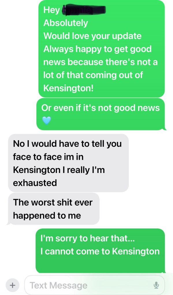 I give out my phone number. Not every day, and not to everyone I photograph or meet in Kensington. When I interact with someone that I think is especially vulnerable, or if they want me to send them pictures I have made with them, I give them my contact information so that I can text an image. Sometimes I have sent pictures via text to people’s parents, and then a parent of someone on the streets of Kensington will have my mobile number.